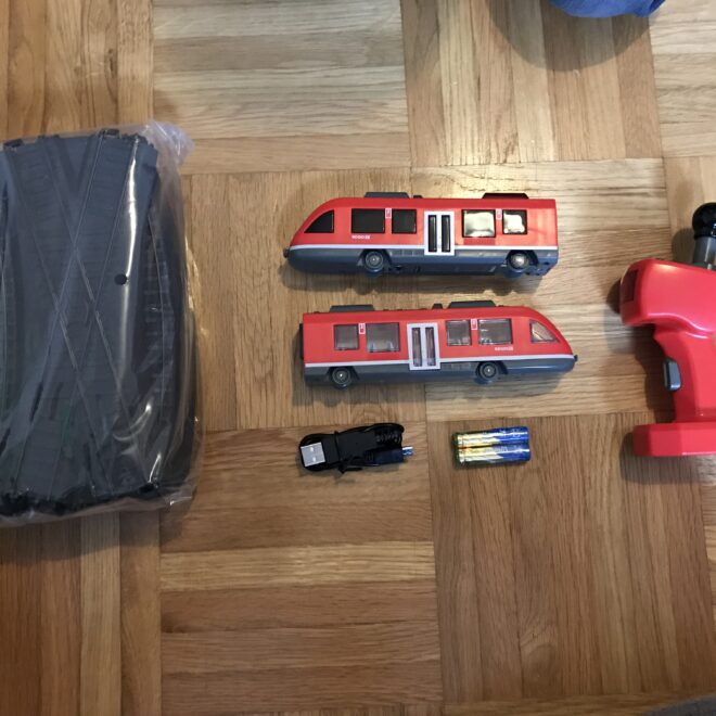 Dann war es endlich soweit. Lex durfte die Strecke für den Nahverkehrszug LINT endlich aufbauen. Das geht wirklich sehr einfach durch Steckverbindungen. Als dann die Gleise fertig zu einer Acht zusammen gesteckt waren, konnte es auch direkt losgehen. Lex hatte unheimlich viel Spaß und der Zug steht seither keinen Tag still 🙂