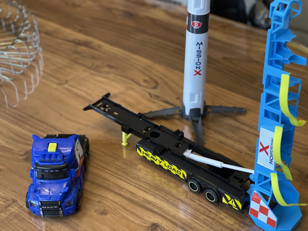 Der Space Mission Truck ist zwar deutlich kleiner als der Unimog, aber der Spielspaß ist auch hier garantiert. Der Truck mit original Mack Lizenz transportiert die 30cm lange Rakete auf seinem Anhänger.
